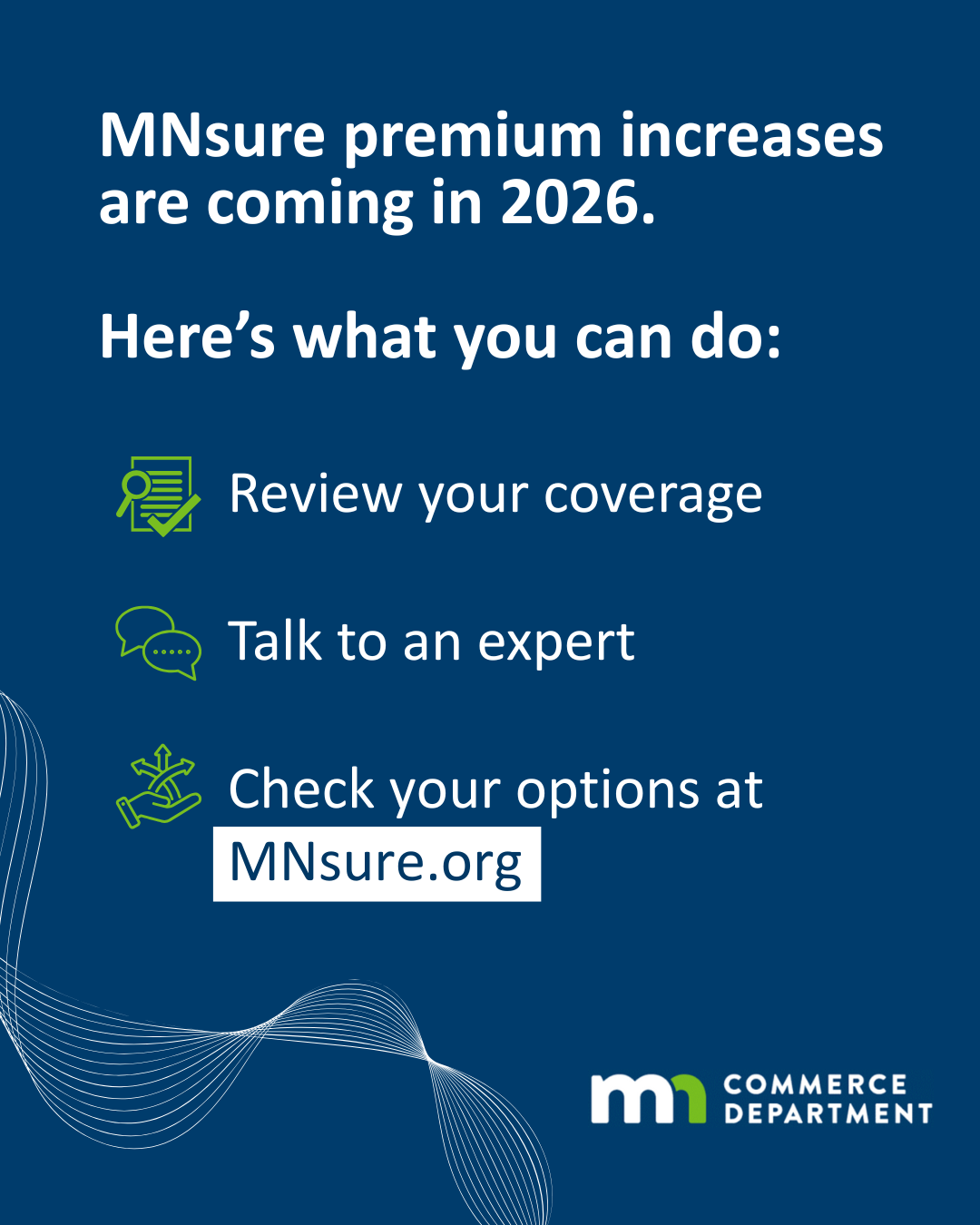 The federal reconciliation bill came with a BIG cost hike, so make sure you have time to review your coverage, talk to an expert, and check out your other options and any assistance you qualify for. Go to MNsure.org for more info!