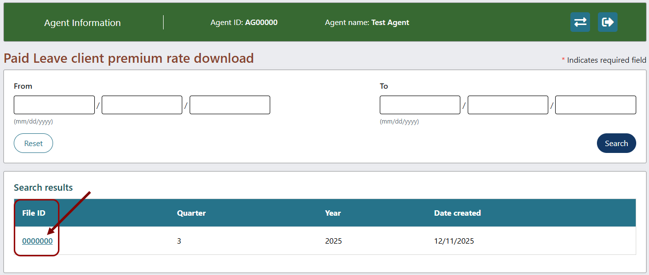 - Enter date parameters to limit your search or leave date fields blank to search for all employer client Paid Leave premium rate files, and then select Search.